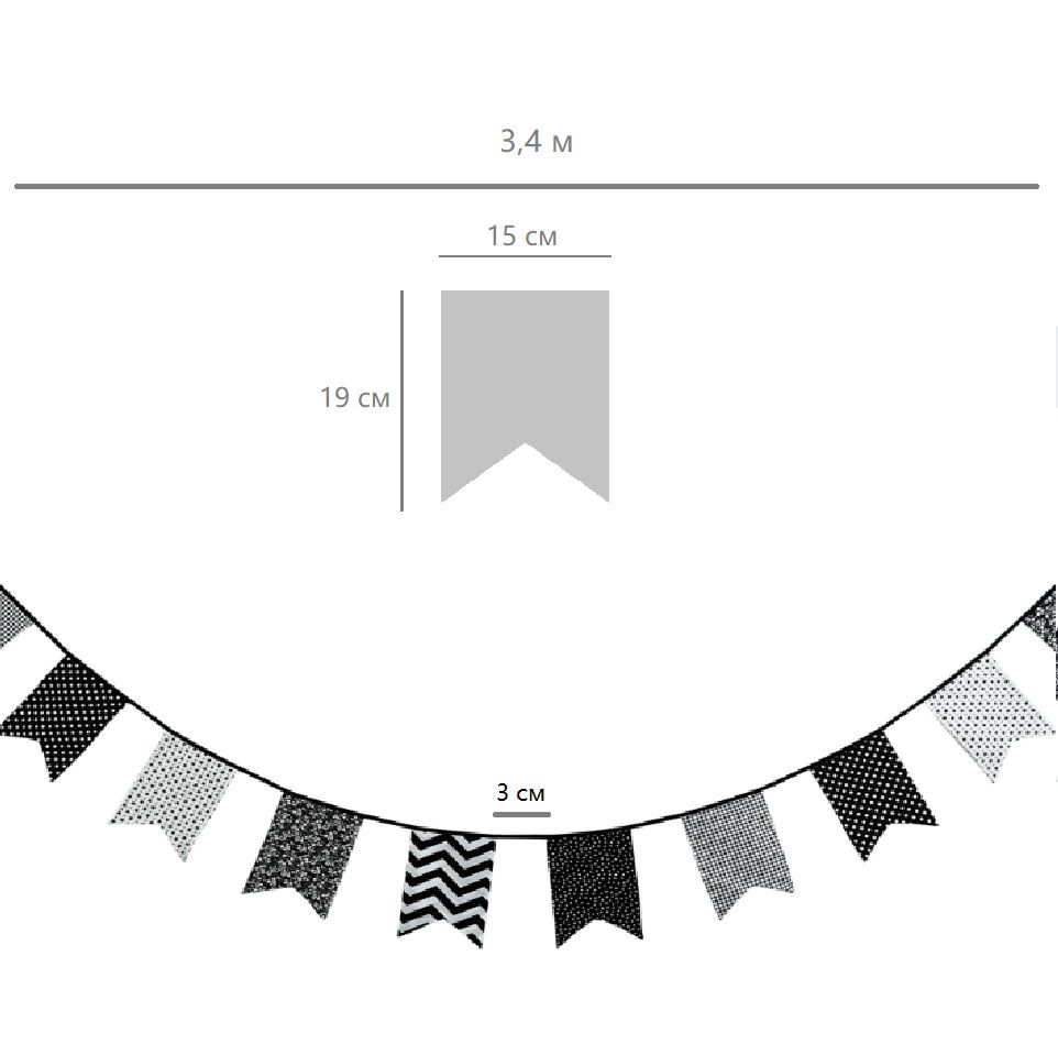Гирлянда состоит из 12 флажков, общая длина составляет 3,4 м, расстояние между флажками 3 см, длина матерчатых флажков 2,1 м, длина лямок с обеих сторон по 50 см